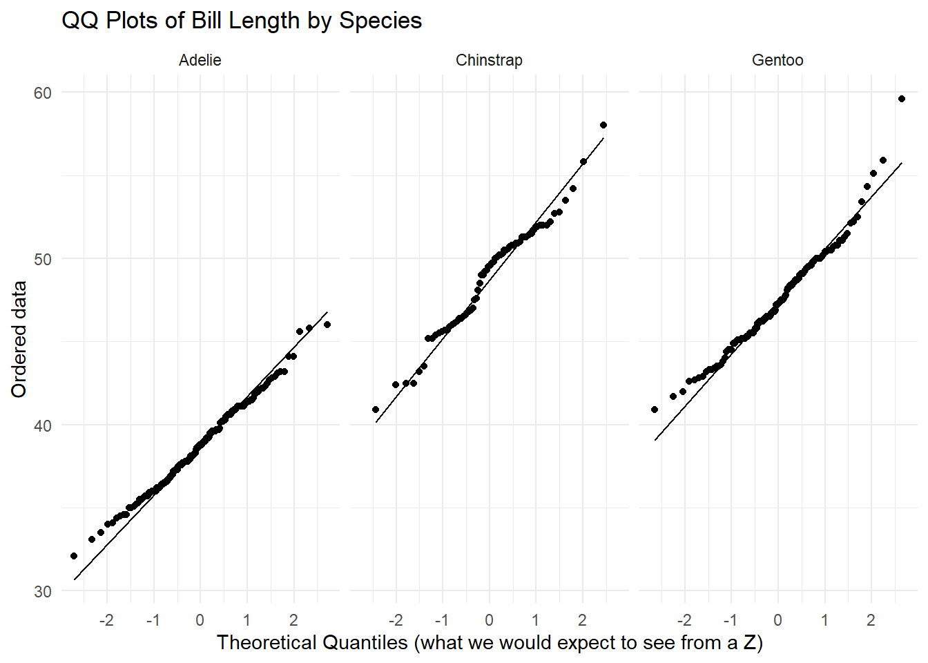 Now, let’s conduct an ANOVA test between species and bill length. First, let’s check our assumptions.