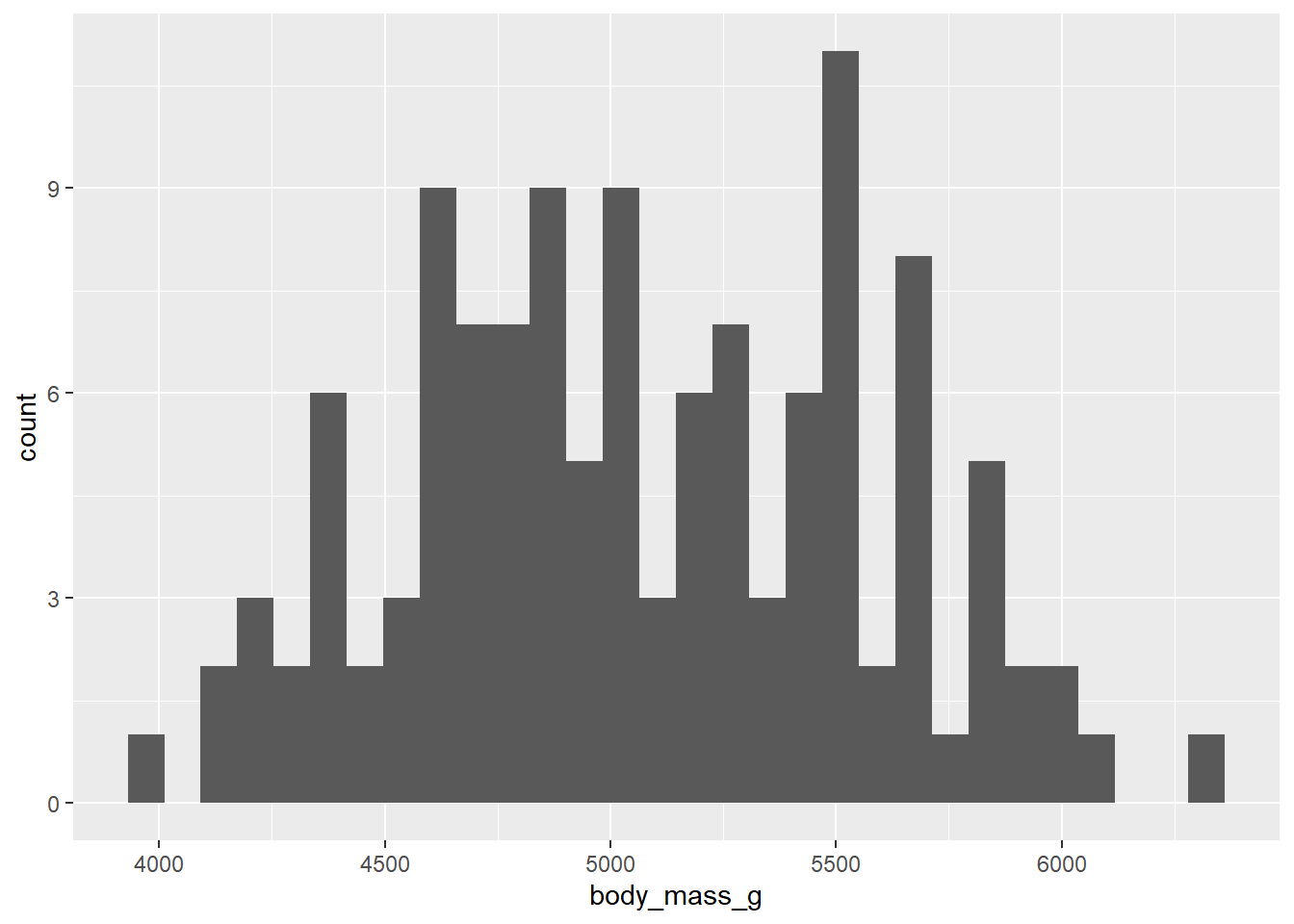 Before we conduct our hypothesis test, let’s explore the data. Below, calculate the mean value of body_mass_g, and make an appropriate visualization to explore the shape of the data.