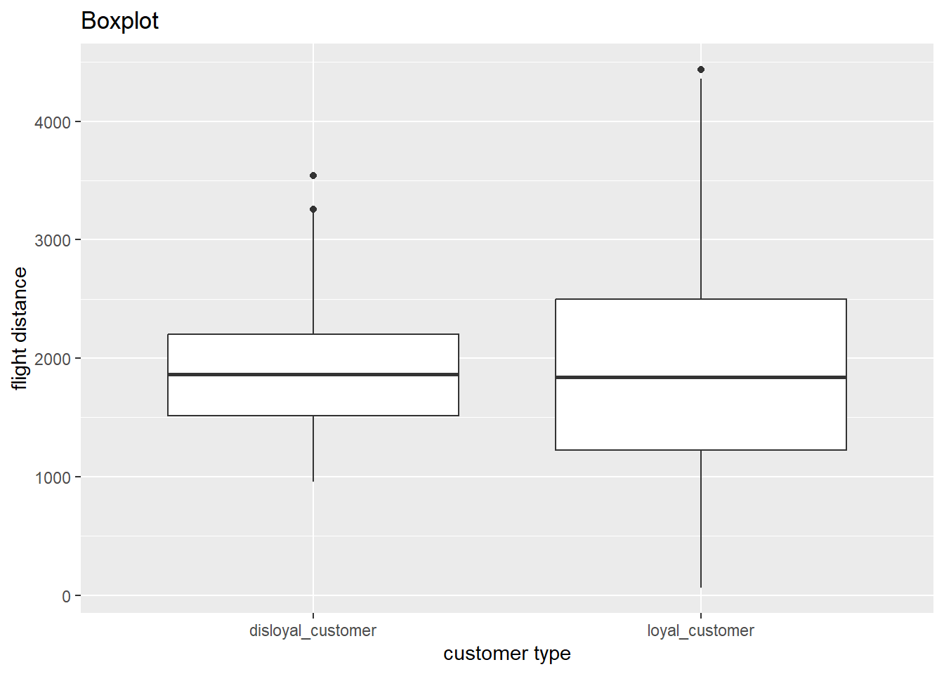 solution: flight_distance is our quantitative response variable; customer_type is our categorical explanatory variable