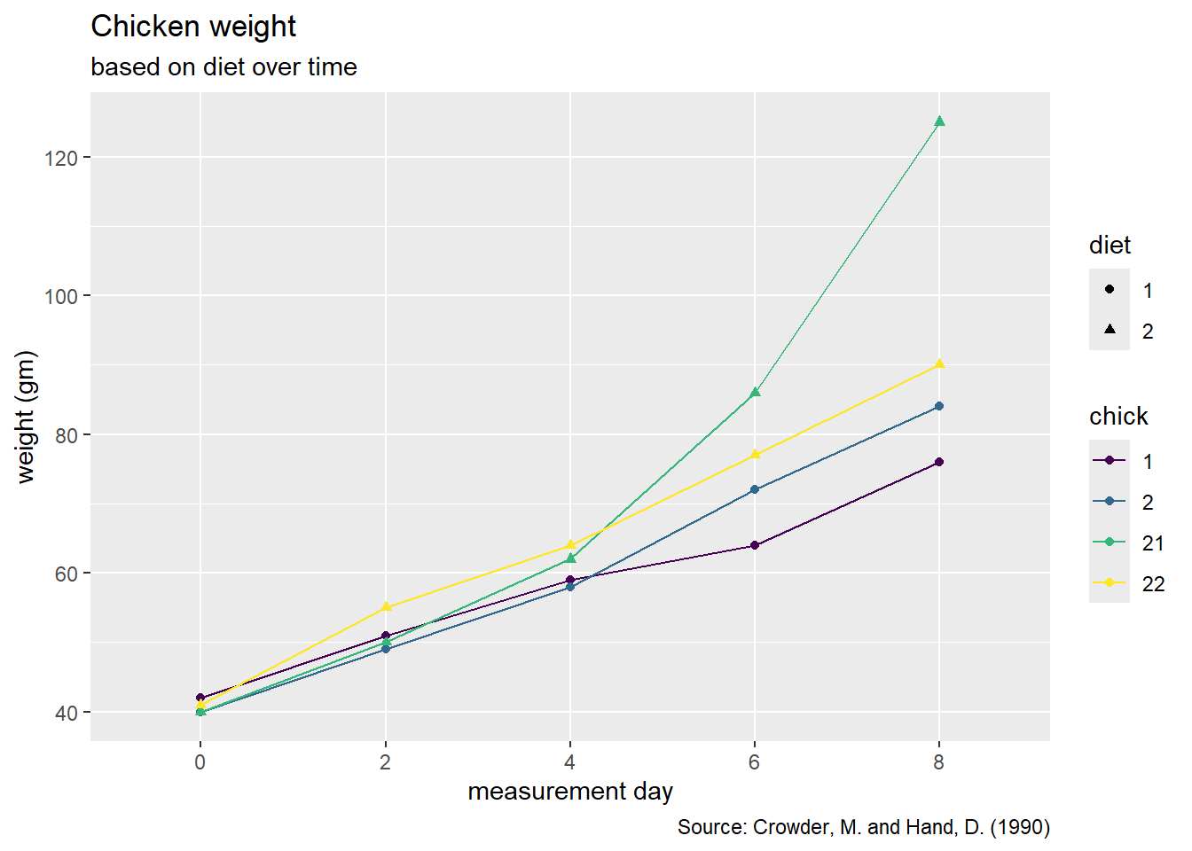 aes(x = time, y = weight , group = chick, color = chick, shape = diet)