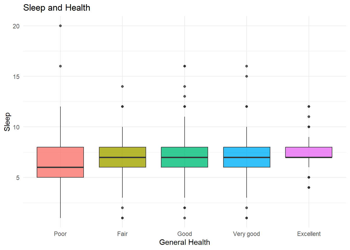 There is slight evidence to suggest that those who sleep less thend to have worse health. However, the variability around the medians (IQR) all tend to overlap, with fair through excellent having extremely similar medians.