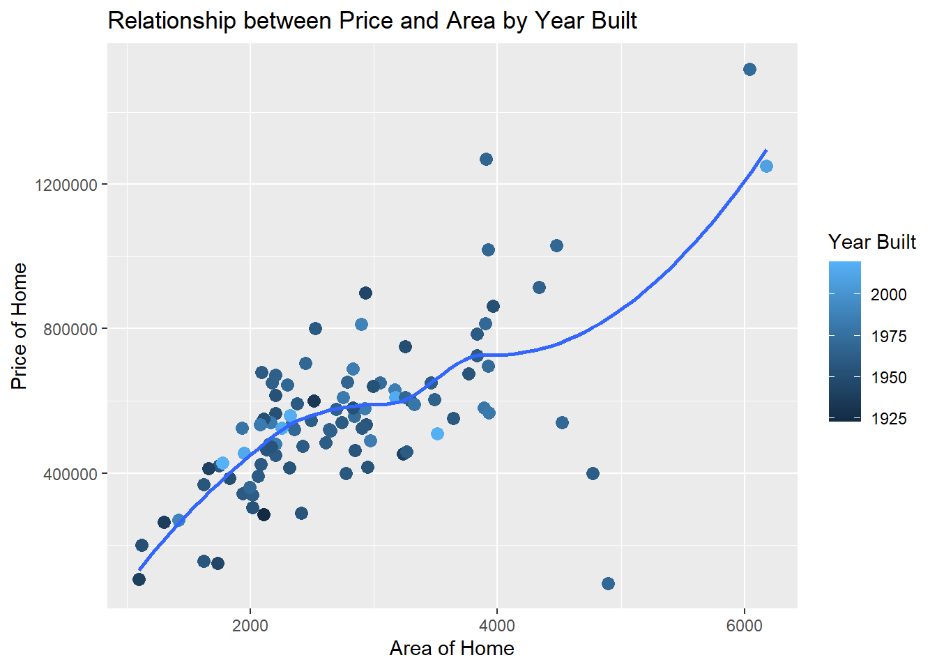 geom_smooth()with the argumentse = FALSEto add a smooth curve fit to the data and color the points byyear_built. - Include informative title, axis, and legend labels.