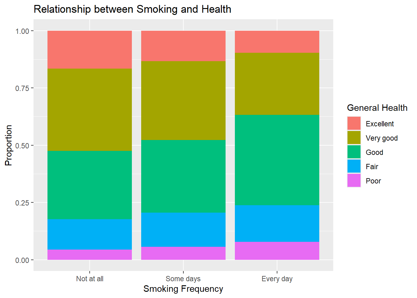 From the graph, you can see that as your smoking frequency increases, your general health tends to decrease. That is, we see less very good and excellent status, and more good, fair, and poor status and smoking frequency increases.