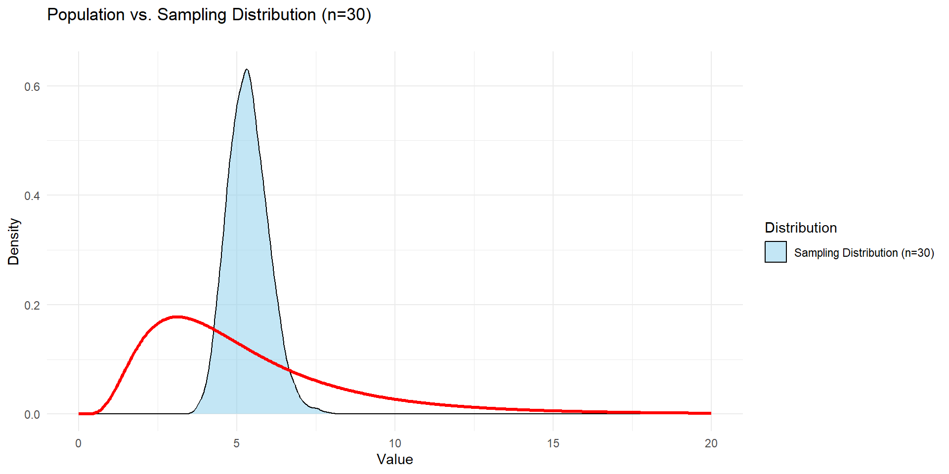 For a large enough sample size (n > 30) and independent samples, regardless of what the population distribution looks like, the sampling distribution of the sample mean will be normally distributed with mean \(\mu\) and standard error of \(\frac{\sigma}{\sqrt(n)}\)