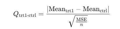 \(\bar{x_1} - \bar{x_2} \pm \frac{q^*}{\sqrt{2}}* \sqrt{MSE*\frac{1}{n_j} + \frac{1}{n_j`}}\)