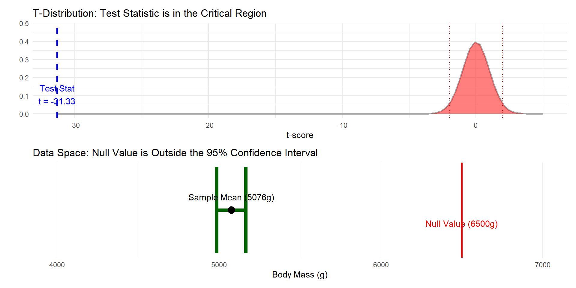 If the hypothesis test leads you to reject the null hypothesis, it means that the distance between \(\bar{x}\) and \(\mu_o\) is greater than the margin of error defined by the 95% CI.
