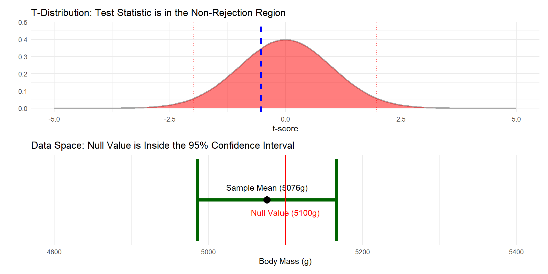 If the hypothesis test leads you to reject the null hypothesis, it means that the distance between \(\bar{x}\) and \(\mu_o\) is greater than the margin of error defined by the 95% CI.