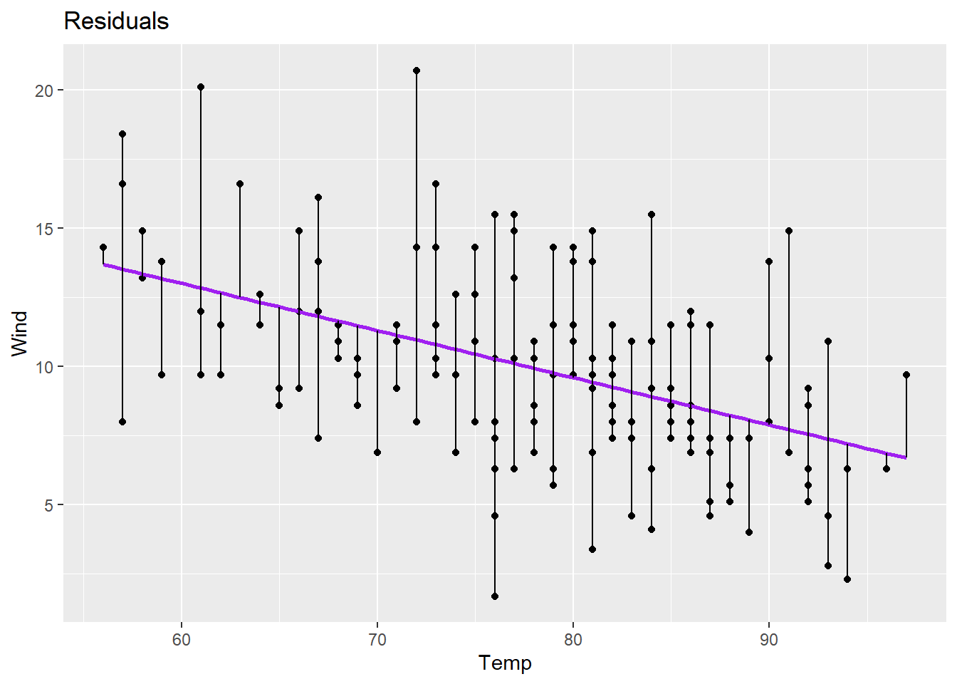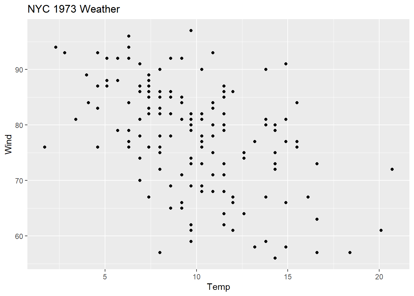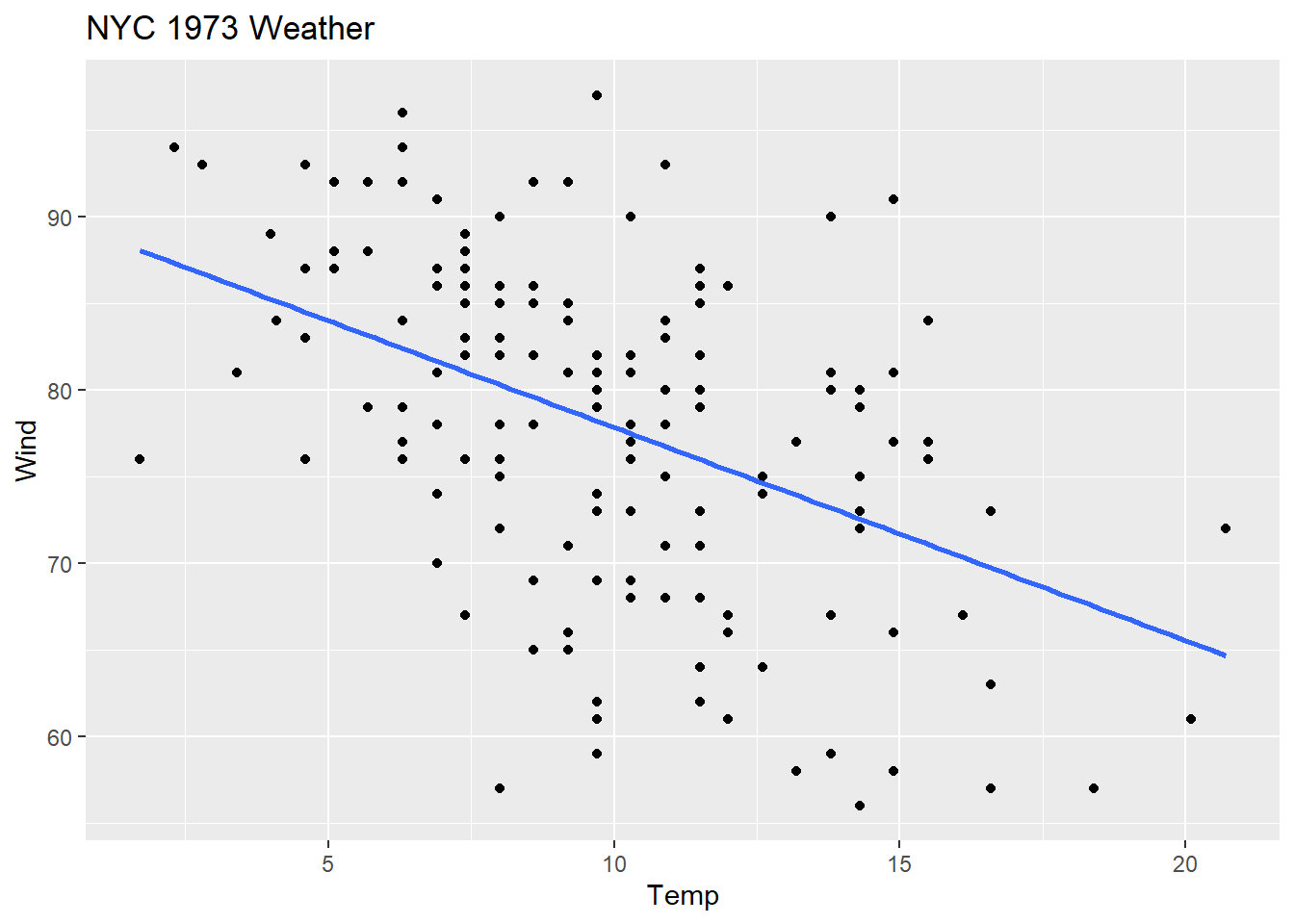 We are going to look at daily air quality measurements in New York from May through September in 1973. Specifically, we are going to look at the relationship between wind (mph) and temperature (F).